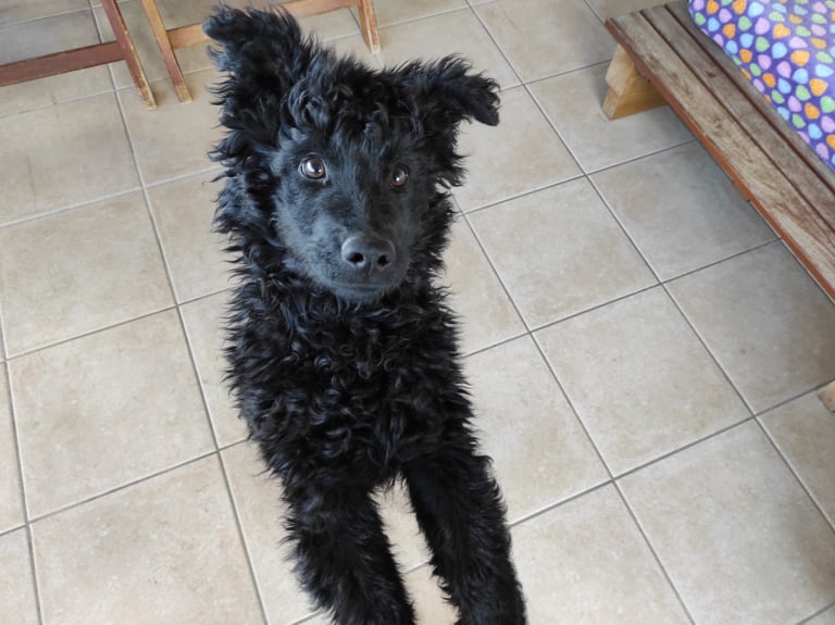 Der junge Rüde ist welpentypisch verspielt, offen, freundlich, neugierig, sehr verschmust, menschenbezogen, kennt Katzen und Kinder. Er lernt gerade die Leinenführigkeit und Stubenreinheit.